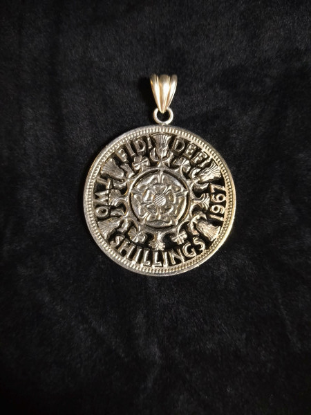 1967年に発行された、イギリスコイン。彫金の切り回しの技術を用いて、透かし彫りにした1枚。文字や図柄が浮かび上がるように、糸鋸でカットしています。
