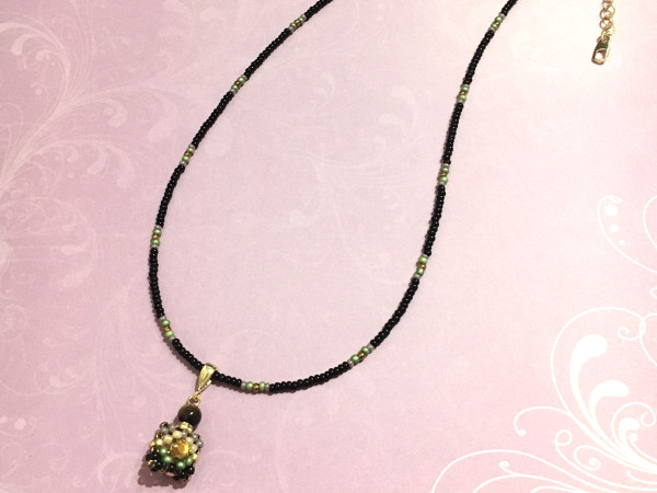手編みの香水瓶モチーフが可愛いペンダントネックレスです