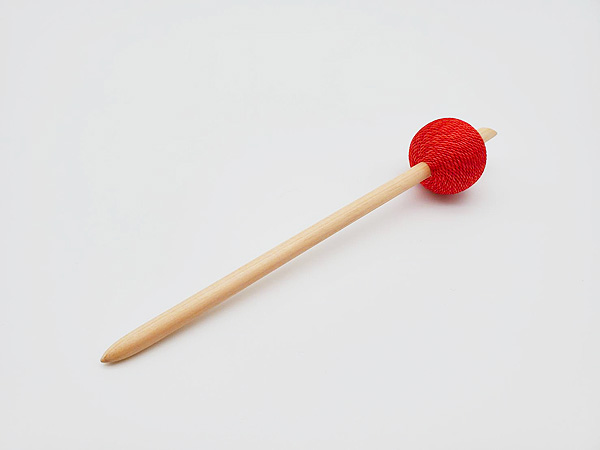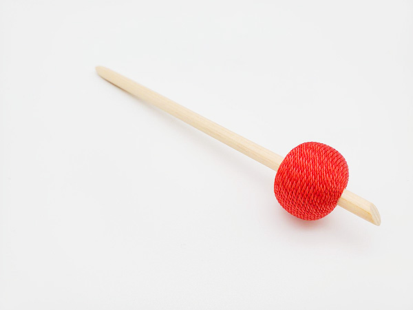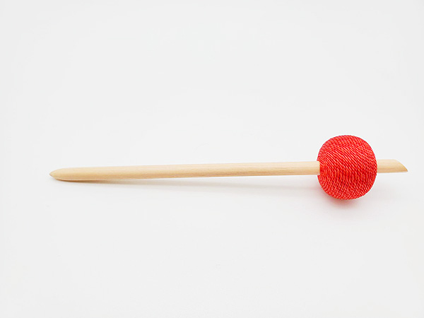 1.ヒノキの木を、直径約6ミリに削ります。 2.ブナの木の玉に、ヒノキの軸の太さに合わせた穴を開けます。 3.ヒノキの軸と、ブナの木の玉を合わせて、強度を確かめ、ニスを塗ります。 4.ブナの木の玉に、正絹を巻いていきます。 「隙間なく、綺麗に巻くには、コツが必要ですね。」(岩渕さん)お手入れ方法
