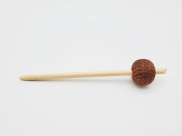 1.ヒノキの木を、直径約6ミリに削ります。 2.ブナの木の玉に、ヒノキの軸の太さに合わせた穴を開けます。 3.ヒノキの軸と、ブナの木の玉を合わせて、強度を確かめ、ニスを塗ります。 4.ブナの木の玉に、正絹を巻いていきます。 「隙間なく、綺麗に巻くには、コツが必要ですね。」(岩渕さん)お手入れ方法