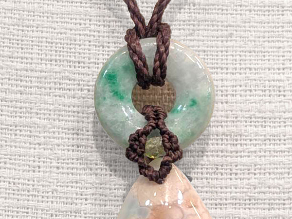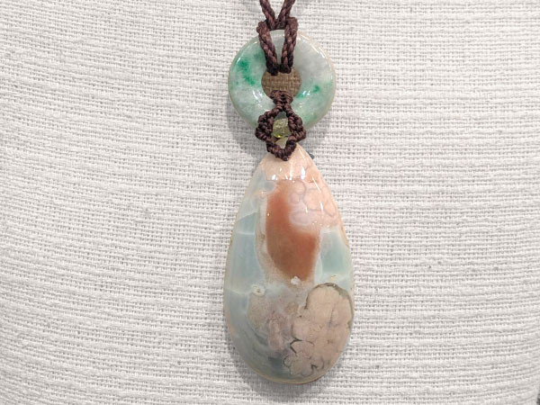 石の中に花のような模様が現れる天然石の桜メノウ(チェリーブロッサムアゲート)のペンダントです。きれいな石が採取できることで有名なマダガスカル島産の桜メノウとミヤンマー産の輪のヒスイを使用しております。