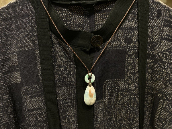 2つの石を贅沢に合わせてみました。少し大きめですが、服と合わせてみると溶け込むようになります。さりげないお洒落として、場所を選ばず愛用出来るペンダントです。